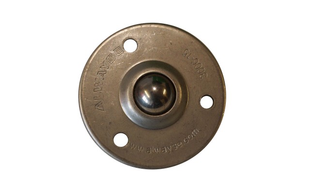 General purpose pressed steel ball transfer unit with a low profile and dirt exit hole.