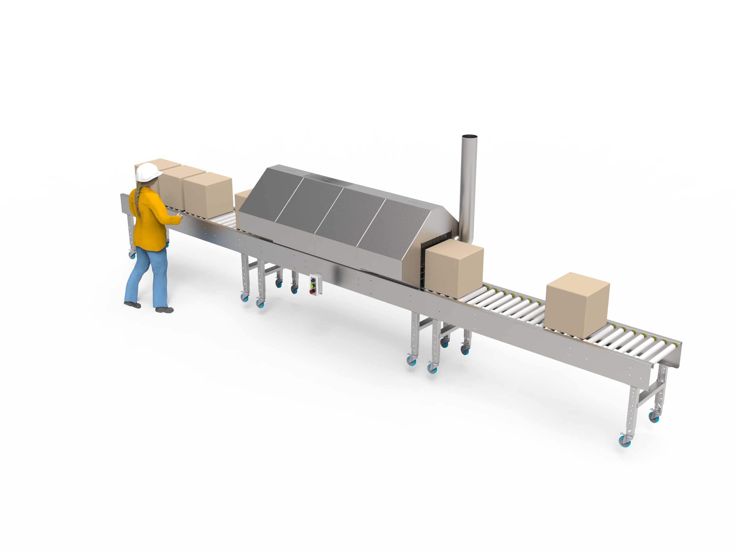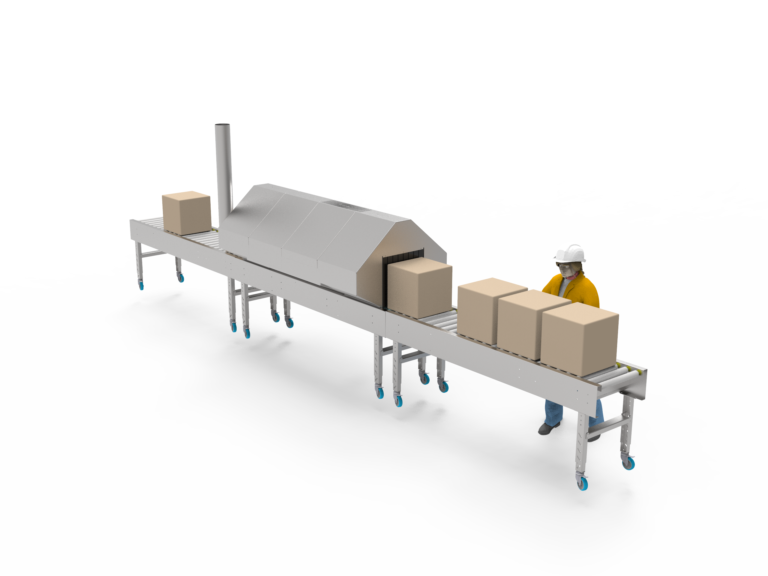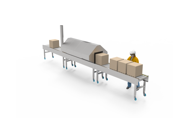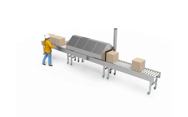 • 2.4m Gravity Roller Conveyor Outfeed with driven section at start to pull product from tunnel.