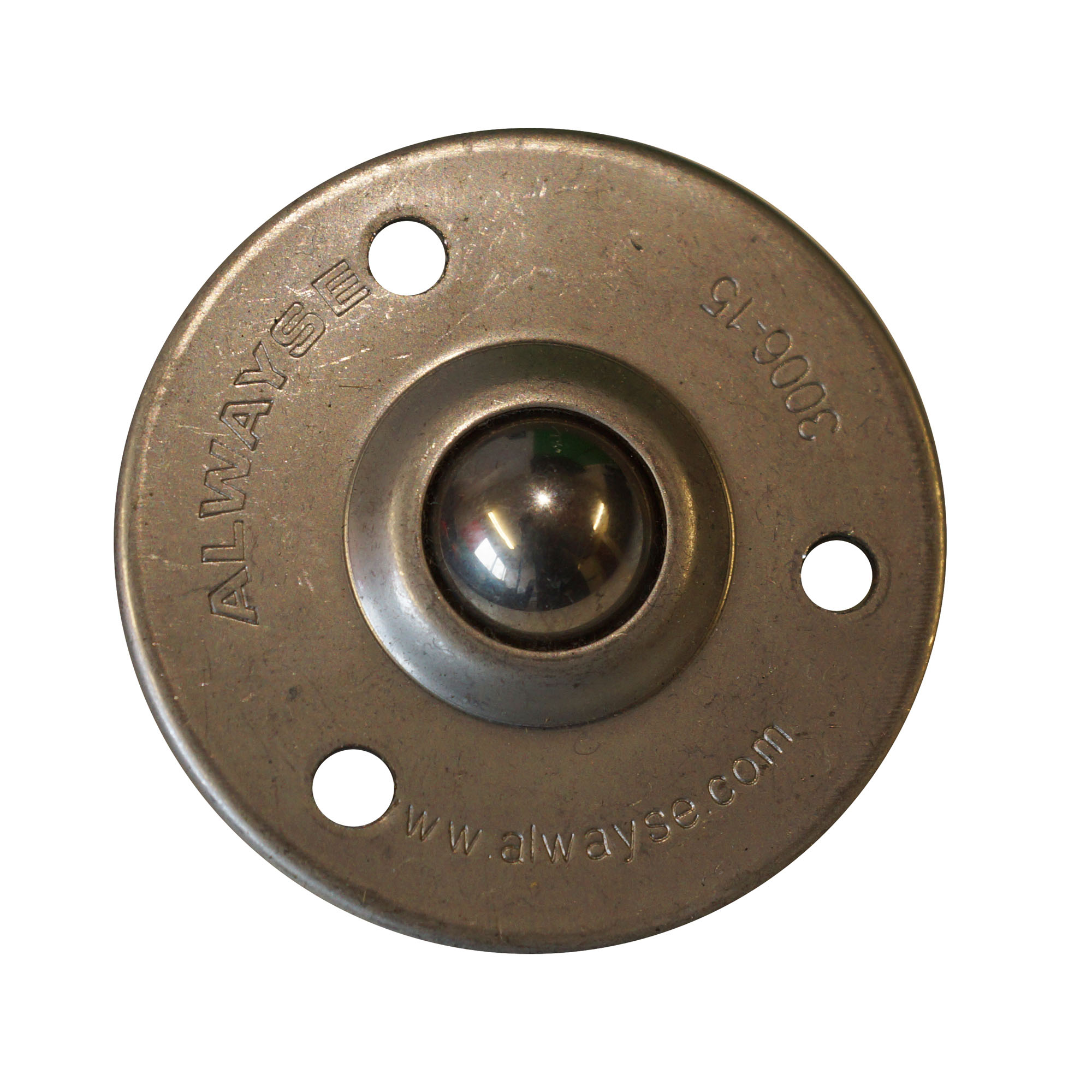 General purpose pressed steel ball transfer unit with a low profile and dirt exit hole.