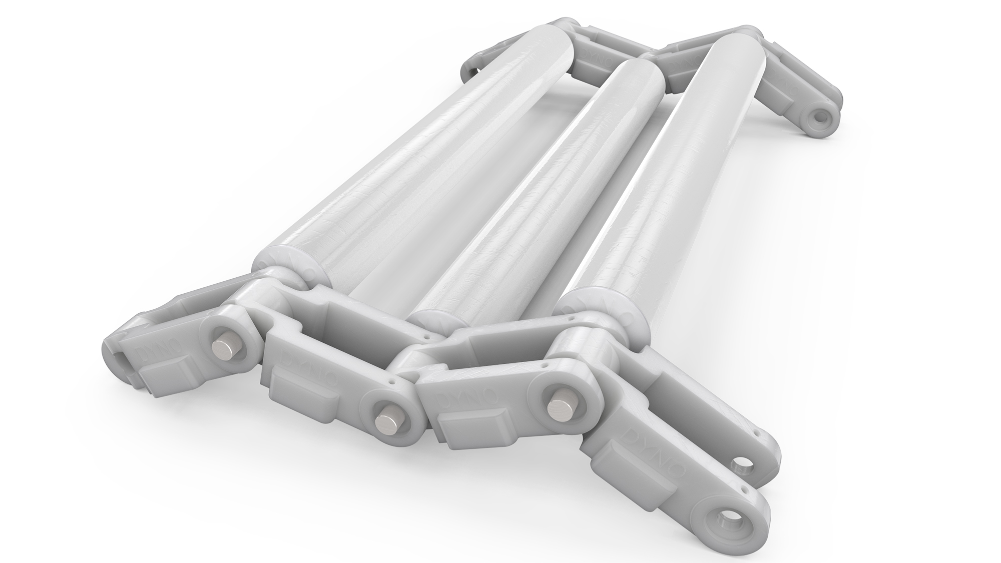The Dyno Chain system, exclusive to Dyno, is manufactured from Acetal, a high strength plastic with a greater dimensional stability when compared to other common plastics. It has the advantage of requiring no wear strip with low co-efficient of friction and is ideal for any challenging product movement. Dyno offers a range of chain options, and colours to suit your application.